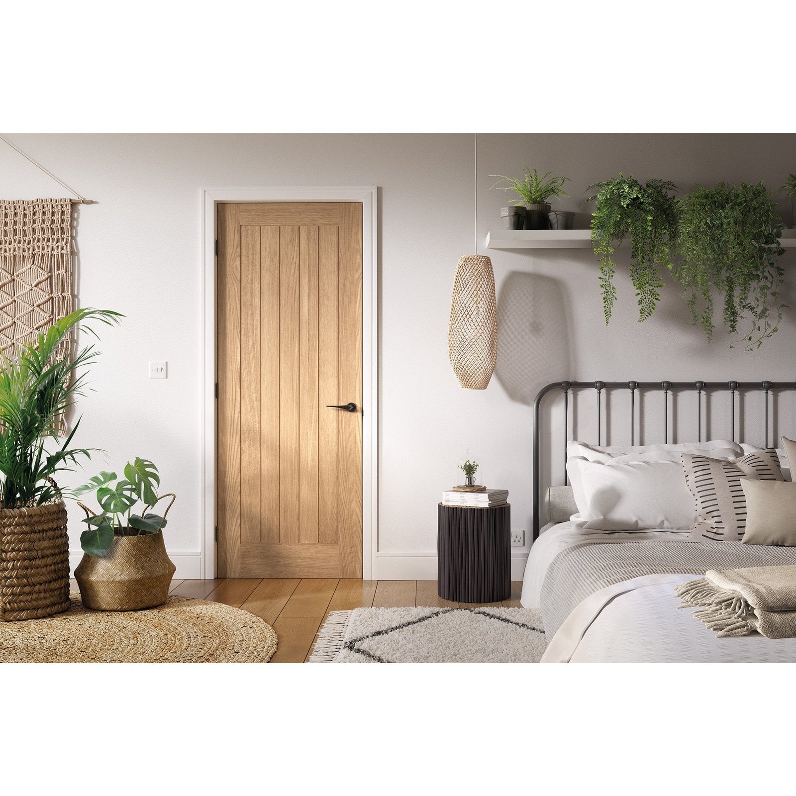 The ever so popular five vertical panel design showcasing geometry in unfinished oak has a modern twist on a traditional style and will look perfect in any contemporary home.