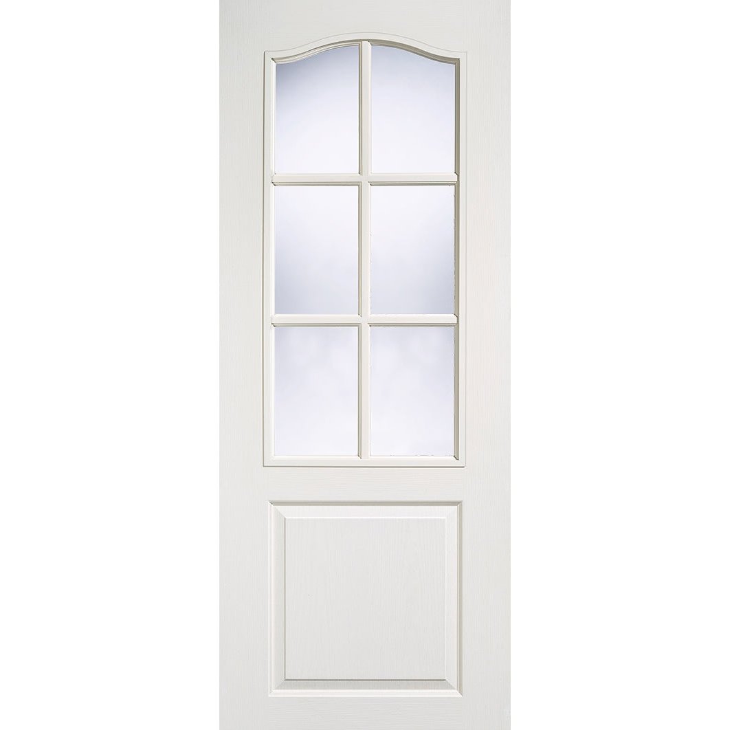 Clear glazed panels feature decorative bars and a curved top edge, with a raised shaped panel below in a white composite material.